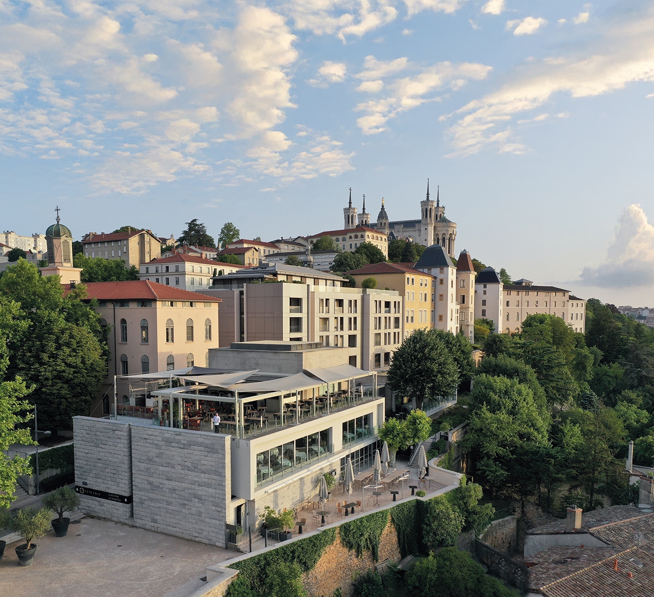 Lorsque les beaux jours arrivent, le Rooftop prend le relais. Dominant la colline de Fourvière, cette terrasse installée sur le toit du restaurant gastronomique offre l’un des panoramas les plus spectaculaires de Lyon. De mai à septembre, elle accueille une cuisine de saison élégante et ensoleillée, pensée comme un bouquet de fraîcheur et de saveurs estivales. Dans ce décor suspendu au-dessus de la ville, l’expérience devient presque méditerranéenne, entre ciel, lumière et horizon.