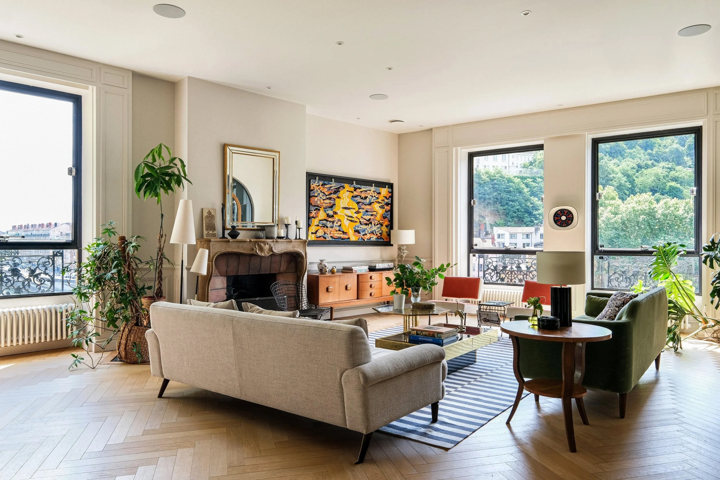 La vaste pièce de vie d’angle, baignée de lumière, s’organise autour d’arches vitrées qui subliment les volumes et révèlent la vue sur la Saône et Fourvière. La cheminée fonctionnelle, les boiseries en noyer, les marbres et les nuances Farrow & Ball composent une atmosphère élégante et apaisante.