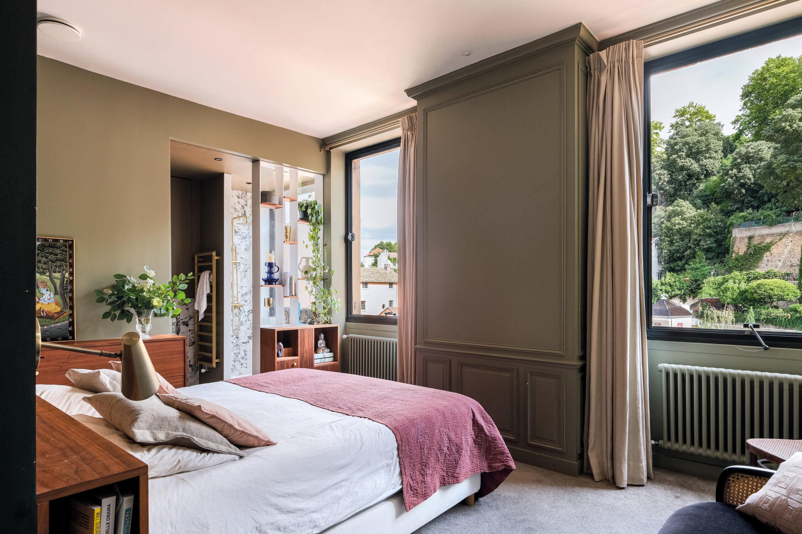 Côté nuit, trois chambres invitent au calme et à la contemplation. La suite parentale, baignée de lumière et ouverte sur la verdure, dispose d’un dressing et d’une salle d’eau attenante. Les deux autres chambres offrent de belles perspectives sur les quais ou les jardins des Chartreux. Partout, le soin du détail se ressent : menuiseries sur mesure, système audio FOCAL intégré, climatisation discrète et matériaux nobles dialoguent avec l’âme du lieu.