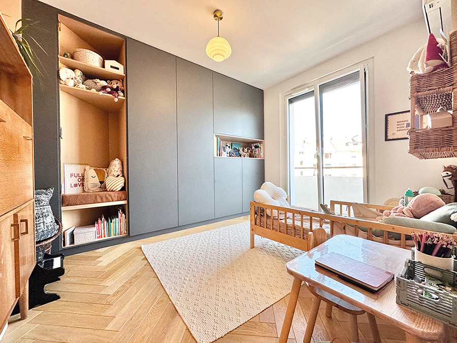 Niché au 6e étage d’une résidence avec ascenseur, cet élégant appartement de 126 m² offre un cadre de vie unique. Il comprend trois chambres spacieuses avec rangements sur mesure, dont une suite parentale avec salle de douche et double vasque. Les deux autres chambres se partagent une salle de bain indépendante et un wc séparé.