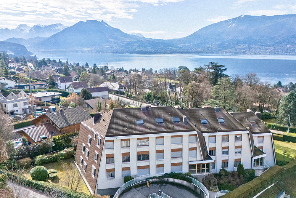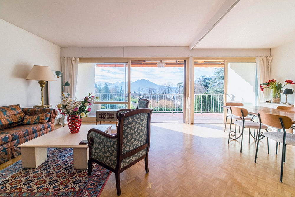 Joie&Frère propose à la vente un appartement lumineux situé à Veyrier-du-Lac, offrant de belles perspectives sur le lac et les montagnes des Bauges, notamment grâce à de larges baies vitrées et un balcon/terrasse de 15,6 m². Constitutif de la copropriété le Shangri-La, au cœur d’un parc arboré de 4 300 m² au pied du Mont Veyrier, cet appartement bénéficie d’un environnement privilégié. L’intérieur modulable permet la création d’une chambre supplémentaire face au lac, alors qu’une grande cave avec mezzanine ainsi qu’une chambre indépendante et point d’eau complètent cette offre.